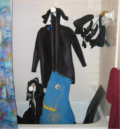 After every day of diving, I throw all my dive gear to be rinsed into the tub and turn on the shower. After 20 minutes or so, I individually rinse each piece and hang the gear on the wet suit rack. After the gear is dry and stored, I disassemble the rack and store it for future use.