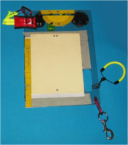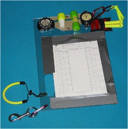 As the complexity or number of the measurements increases, it is convenient to customize your own mission-specific data board. These are usually home-made. They can be made of any waterproof material. Plexiglass (acrylic) and Lexan (polycarbonate) are the most common materials. Ours were made from 2 thin 12" x 14" sheets of Lexan (its what we found at a local home improvement vendor) bolted together to provide more strength. In general, polycarbonate (used to make jet canopies) is less brittle and much stronger than arcylic.