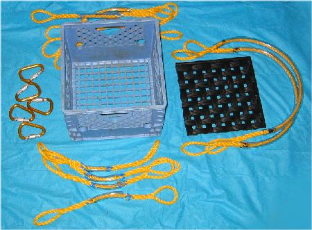 For transporting weights between the surface and the bottom, we use an old-fashioned milk crate with a padded (outdoor rubber mat trimmed to size) bottom and a few lines (with clear Tygon tubing acting as an abrasion guard) and carabineers for attaching top a either a lift bag or ascent line. This system easily handles 60-70 pounds of weight.