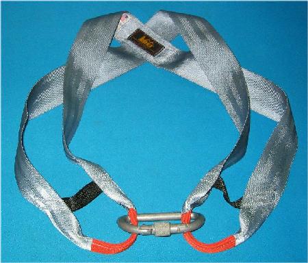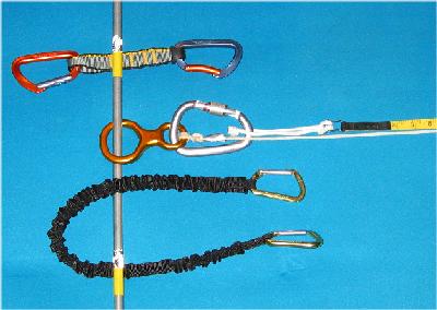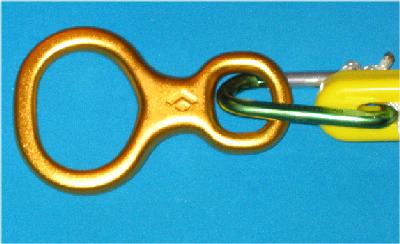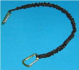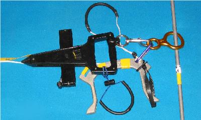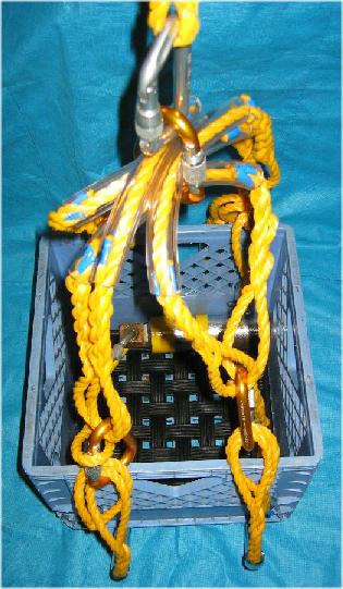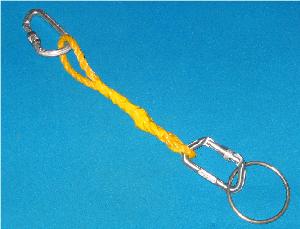 It is often cumbersome for divers to carry tools, especially in rough water, when dangling or hand-held tools can complicate entry/exit from the dive boat. So, we typically drop the tools into the water using a separate line. The divers descend to the work site, move to the deployment line, grab the appropriate tools, use the tools for the dive, and return the tools to the deployment line prior to ascent. This also facilitates sharing of not-used-for-whole-dive tools among different dive teams. We use a short double eye-spliced line (below, left) with locking carabineers and a 4" stainless steel ring (for attaching gear with clips) as our "deployment device." At the work site, this short line is attached to a line of the appropriate length for the depth of the work site. With more cumbersome or abundant items, a short mini-shockle line or climber's double carabineer can be used to hold items.