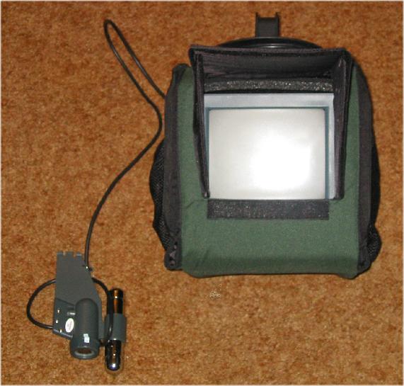 It is often convenient to have an idea of a potential dive site before entering the water. Since commercial-grade video monitoring systems and ROV's are quite expensive, we sometimes use a relatively low cost (~$300.00) alternative that can be useful in the recreational, public safety, or scientific diving communities. This is a fisherman's video camera. Although intended primarily to look for a fish population, it can be useful in shallow diving operations. Ours is a Cabela's Advanced Angler II panning underwater camera. This is a weighted, submersible B&W video camera with 360 degree panning capability, 65 feet of video cable (the cable reel serves as a carrying handle), wireless control of scanning, self-contained red LED lighting, a battery (with charger) that typically lasts 6-7 hours of continuous viewing, and a 7" B&W monitor. The carrying case has built-in light shades for the monitor. The 13.5 pound unit is shown below.