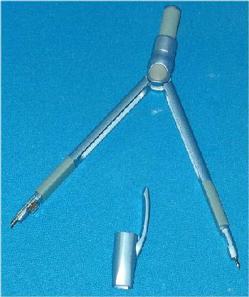 One particular device we particularly like is a "ball-point" compass (Staedtler #9582). The compass folds into a convenient ball-point pen shape which protects the device while covering the sharp point. The compass is shown below in closed (left) and open (right) positions.