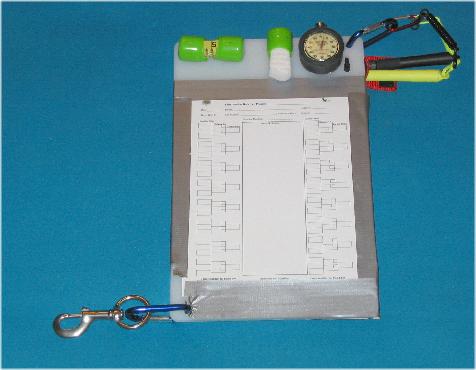 A much less elaborate (and far less expensive) data board can be made from an inexpensive plastic cutting board that can be found in the kitchen supply area of discount stores. The board can be quickly assembled by drilling a few holes and attaching bottom timer, eraser, fiberglass tape holders, and pencil holders with tie-wraps. This board is most useful for missions where sketching is more important than detailed measurements or as a less expensive device for students taking underwater surveying courses. Our "cutting board" is shown below. Pencils will not write on the surface of the board, so data is collected on waterproof paper secured to the board with duct tape.