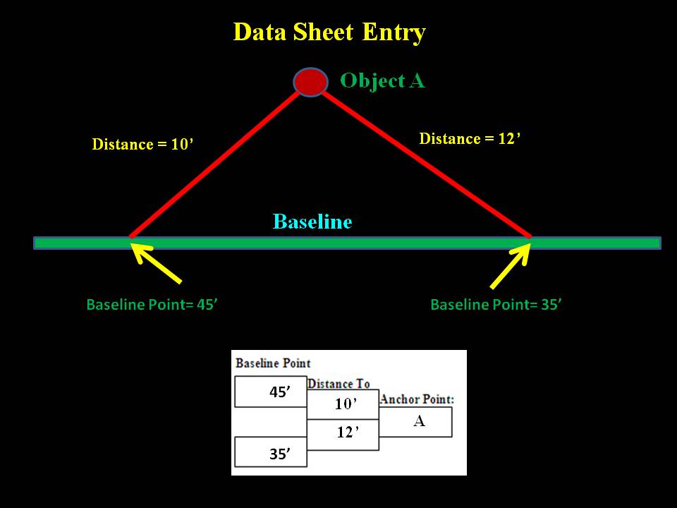 In practice, distance measurements are made as a 2-person team: One person serves as an anchor and maintains the zero position of the measuring tape on a designated, marked and described point. The second person (with both the data board and the surveying tape) moves away from the anchor to the baseline to measure and record the mission-designated points to be measured. The format of the data sheet (PDF versions of our data sheets (Based on the MAST data form) in two formats are available for download: with the umich Logo.pdf and without umich logo, No Logo.pdf ) facilitates trilateration data recording.