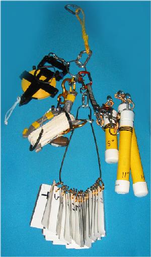 The carabineers also allow the markers to be easily carried (using a fish stringer, with added clip) for deployment, During preliminary survey of the site to be investigated, one diver removes the markers, one at a time, from the stringer, attaches a weight, if needed, and places a single marker on or near the object to be mapped/observed, while a second diver records the marker designation and a description of the object being marked. A stringer with 20 markers is shown below, left.