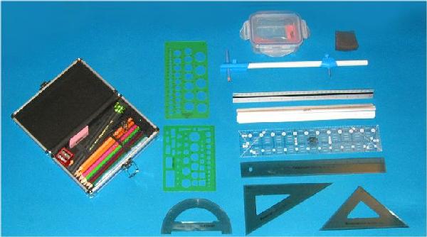 Inside the cake carrier is a pencil box (holds a selection of colored pencils, a pack of "eco-pencils" (these are triangular shaped and quite comfortable to use ... ours are the Dixon "Tri-Conderoga" brand), a pencil sharpener, soft rubber eraser, and a compass). a "beam compass" (used for drawing large arcs), a black piece of hard foam to protect the rather sharp beam compass point, an architects scale, several rulers, a protractor, a couple of drawing templates, and a couple of drawing triangles. Quilt shops and fabric stores are convenient places to get rulers. (Rulers for fabric measurements tend to be very accurate and most start with the zero point on the exact end of the ruler.)