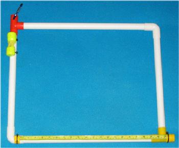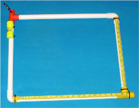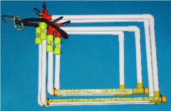 Grids are a rectangular or square framework used to establish coordinates for measurements. They range from simple PVC pipe frames to elaborate metal matrices. For recreational divers, they are commonly small PVC frames used to document (either by photographic or trilateration measurement) small objects. Our small grids were made from a discarded child's toy called Ladder Ball. This toy provided a source of already prepared small (1") diameter PVC lengths and connectors. A simple grid for measuring objects is shown on the left. For photos, a second scale helps establish correlation between object on the bottom and the resultant image.