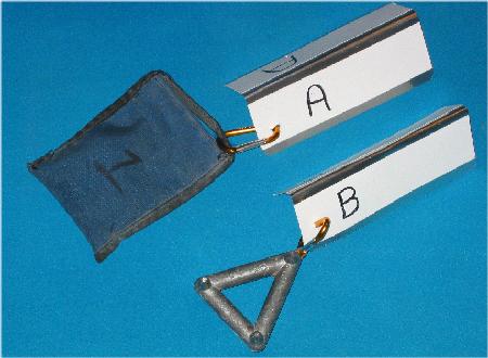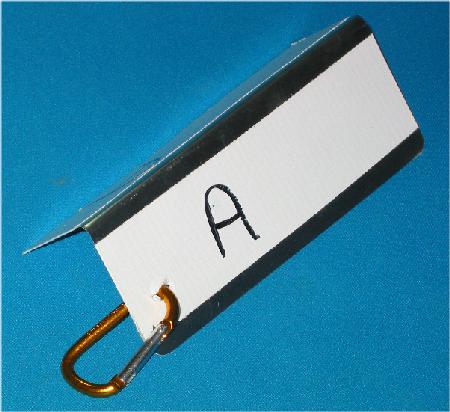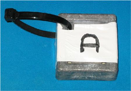 It is necessary to mark and describe objects that will be placed on an underwater grid plot. These markers can be anything from plastic strips cut from consumer products to formal forensic evidence markers. Ours are made from aluminum Step Flashing obtained from the roofing section of a home improvement store. These are 5" x 7" (12.7 cm x 17.8 cm) thin aluminum strips that are commonly sold in 10-packs for a couple of dollars. After a 15/32" hole for a non-climbing carabineer is drilled near a corner (the entire package of 10 is clamped together and drilled all at once to ensure that the holes are coincident), the strips are folded lengthwise to form an inverted V-shape. We use a strip of white duct tape on both sides as a writing surface and label each marker with permanent black ink. Lastly, we file down the corners to minimize sharp edges. We only use alphabetic characters for markers to minimize confusion with numerical measurements on the data sheet. A completed marker is shown below, left. In areas where there is concern about markers being moved, a weight (typically, a diver's weight belt pouch, a standard weight-belt weight (using a tie wrap), or a fisherman's 2 pound triangular weight) can be secured with the small carabineer as shown below, center. For some objects, a polypropylene tie-wrap can be used to secure the marker to the object (below, right).