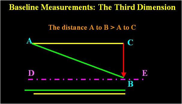 For example, assume you are measuring an object at point A in the diagram below. If the baseline is laid at point B, then your direct in-water measurement from the object to the baseline is the green line distance AB. If you were to plot this AB distance on a chart (represented by the magenta line, DE) post-dive, your distance (green line at the bottom of the image) on the chart be too long (you would indicate that object A is farther from the baseline that it actually is). This is because the linear measurement AB does not include any angular (distance above or below the plane of the baseline) information.