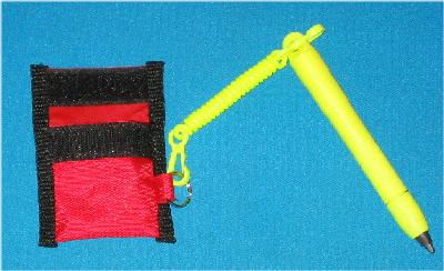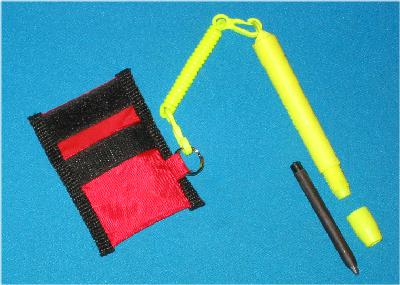Trident SL-13 pencil: This is a large stick of graphite surrounded by a hard plastic case. The pencil has a tension coil to attach to the data board (or any size slate or console). On the data board, we use an empty emergency CPR face shield (from American Heart) container as a pocket to protect the graphite tip. We carry 2 pencils in case one is lost, broken, or uses all of its graphite during a dive. The pencil cord is secured to the board via a couple of non-climbing carabineers.