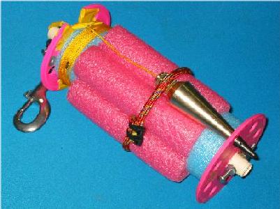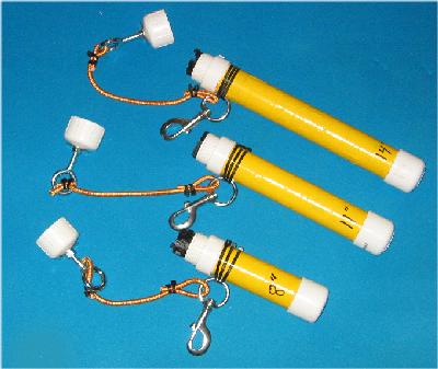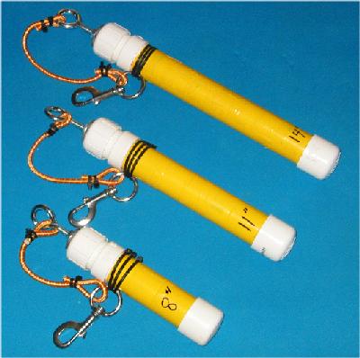 Tie warps (cable ties) are a convenient means for securing any number of objects. We have standardized on 8", 11" and 14" lengths. (Polypropylene tie wraps, commonly black in color, are preferred since polypropylene is extremely hydrophobic and resists absorbing water; nylon tie wraps, commonly, but not always, white in color, absorb water and, over time, become quite brittle and break.) The small size of tie wraps can complicate using them at depth, especially when the diver is wearing gloves. We carry tie wraps underwater in a 1 1/2" PVC tube with added bottom cap, screw top and a large stainless steel diver's clip. A small fishing weight held in place with aquarium cement in the bottom cap facilitates an upright position for the carrying case. (We use a significant amount of cement so that, after drying, the bottom cap will have a uniform smooth surface. To minimize loss of the screw-threaded top, a swivel in the top piece is connected to the dive clip with a small piece of bungee cord. (Caution: Over-tightening any PVC threaded connection makes it extremely difficult to open underwater.) Finally, a yellow duct tape wrap increases in-water visibility. Our containers (which each hold ~70 tie wraps) are shown below.