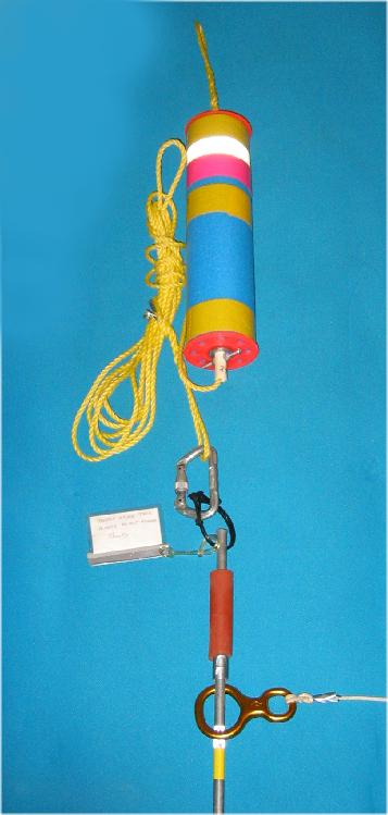 In-water plumb bobs are simply a weighted line and a float to establish a vertical line. These can be as simple as any weight and a piece of foam. Since we had have a lot of swim noodle based floats, we applied the same technology to our plumb bob. It is certainly more elaborate than need be. However, its size facilitates in-water handling with dry gloves and having a clip on the device makes it easy to carry and deply. The 10 foot line is easily recovered after deployment by simply using the end handles ... holding the device in a horizontal position and turning the device raises the line until the bob is acquired and secured with the bungee cord. Our plumb bob is shown below, left, and as it would appear when deployed, right