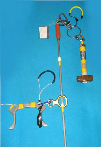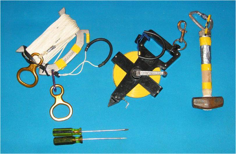 Baselines are the reference line from which trilateration measurements are made. On shore (see Near Shore Mapping), we use a 100' diver's line (same line as we would use underwater ... the line holder with a wrist lanyard has yellow duct tape markings for added underwater visibility) as the baseline. The addition of gold climber's figure eights (below, left) to the handle and the end point of the line provides a convenient means of pulling the line taught and then rapidly securing the line to the ground with a screw driver (Screw drivers are easy to find, embed, and to remove when the project is over.) driven through the opening of the figure eight with a small sledge hammer. This type of hammer is small (for convenient storage and carrying underwater), has a large striking surface, and its mass provides a more-effective-than-conventional-carpenter's-hammer underwater driving force. In addition, the wooden handle can be easily drilled to provide a means of attaching clips to the handle. We added some yellow duct tape to the handle for increased underwater visibility and a carabineer to hook it to either the deployment line, our underwater baseline poles, or a diver. After the baseline is in place, we add a surveyor's line (ours have a wrist lanyard and clip added for underwater use ... there is no need for these attachment points if the surveyor's tape is only used on the surface) along the nylon line for distance measurements. The nylon line adds strength and security to the surveyors tape. The tools used for our on-shore baseline are shown, below, right.
