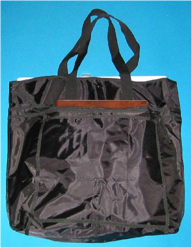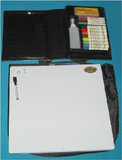 A dry-erase white board is a convenient briefing tool. Ours is a 17" x 17" magnetic white board with an Expo dry board writing kit (colored pens, cleaning fluid and dry eraser), below, left. This stuff conveniently fits into a large "teacher's tote," below right. We also use the large teacher's bag to carry large rolls of duct tape, a supply of underwater writing paper, charts, and other small items.