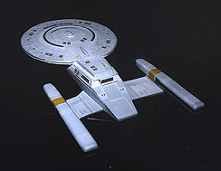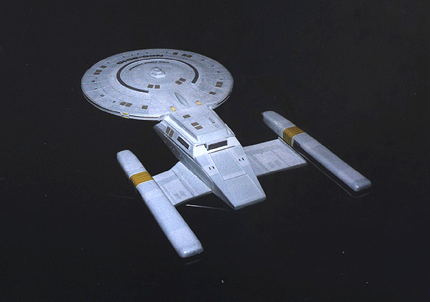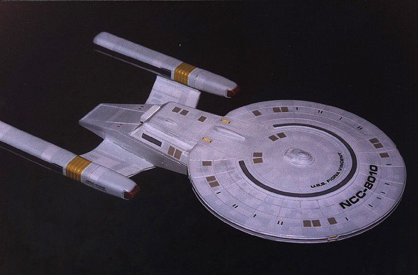 Model notes:The Heywood Floyd class starship was designed by J. G. "Zoo" Lobbezoo in August 1991. Zoo built a 1:600 scale model of the ship in 1993. It is 22 inches long, and uses primary hull and nacelle components from the AMT/Ertl Enterprise-A kit, and styrene sheet for the secondary hull and nacelles. ![]() Digitally modified photo of the 1:600 scale model.Since then, the design was reworked to incorporate "modernizations". The U.S.S. Fiona Vincent model was built by Markus C. Nee, based off of the larger model, and represents a "modernized" Floyd. It was completed in July 1997 and is in 1:1400 scale, approximately 9 inches long. Primary hull was made from custom resin castings with addition of sheet styrene structure. The secondary hull is made from sheet styrene. Warp nacelles are highlighter markers. The finish is airbrushed Tamiya acrylic paints, Letraset and Chartpak dry transfer lettering, and AMT decals. The model is currently on display at Rider's Hobby Shop in Macomb, MI. Here's a link to Dr. Fiona Vincent's web page.