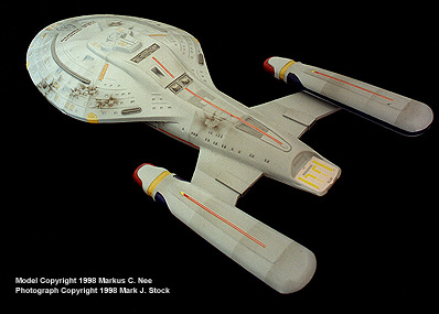 Model notes:This model was built by Markus C. Nee and was completed in July 1998. It is in 1:1400 scale, and is approximately 11" long. The primary and secondary hull components are from the Monogram Voyager 3-Piece Set. The warp nacelles are from an AMT/Ertl 1:2500 scale Galaxy class model. Nacelle pylons are scratchbuilt from sheet styrene, and impulse engine grills are from a Cannon and Company diesel locomotive detail set.