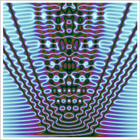 The plot in the banner of this website shows typical dynamics in space (horizontal) and time (vertical) of a solution to the focusing nonlinear Schrödinger equation in the semiclassical regime. For more information about this image, see [J18] and [J31], and to see other images of this type corresponding to different solutions, see [J27]. The plot in the paragraph above shows the dynamics of a solution in the semiclassical regime of the sine-Gordon equation. This equation has the additional complication of "topological charge", which leads to new phenomena in the semiclassical limit; see [J35].