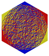 Prof. Miller's work on this subject is related to establishing universality of random matrix theory statistics in various problems. With J. Baik, T. Kriecherbauer, and K. McLaughlin, he has studied the problem of random tilings of hexagons by rhombus tiles (see the figure in the paragraph above for an example) and shown that universality holds both in the bulk (the so-called "temperate region" where the tiles are randomly arranged) and also at the edge (the boundary between the temperate region and the so-called "polar zones" where the tiles are all oriented the same way), but with different limit laws connected with random matrix theory. Working with J. Baik, P. Deift, K. McLaughlin, and X. Zhou, he has also shown universality in a problem of percolation (transport in random media). His current interests lie in developing mathematical methods to extend the validity of universality beyond the classes of probability measures usually considered for random matrices, in particular to admit "nonanalytic weights".