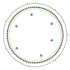 One of the simplest Riemann-Hilbert problems is that which characterizes the system of orthogonal polynomials with a given measure of orthogonality on the real line, or on the unit circle. Not only is this Riemann-Hilbert problem simple to formulate, but also it is of far-reaching importance because of the role that orthogonal polynomials play in random matrix theory. Therefore, much of Prof. Miller's current interests involve the asymptotic characterization of orthogonal polynomials in the limit of large degree, in various circumstances where the measure of orthogonality is "defective" in some way. The image in the above paragraph shows one aspect of this asymptotic theory, the presence of a fixed finite number (6 in the figure, while the polynomial has degree 104) of "spurious zeros" of orthogonal polynomials on the unit circle when the weight function has a related number (7 in the example shown in the figure) of points of discontinuity of any derivative. For more information about this phenomenon, click here.