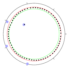 In all images, the black circle is the unit circle in the complex plane, with exterior tick marks indicating the angles at which there exist jump discontinuities in derivatives of the weight function. The red circle indicates a degree-dependent radius beyond which there are no zeros for large enough degree. The green circle is a degree-dependent attractor for the majority of the zeros. The zeros of the polynomial themselves are shown as small black dots. Finally, the lavender dots are the zeros of a certain rational model function that is explicitly known; when these occur inside the unit circle they each attract precisely one zero of the polynomial, and when they occur outside of the green circle they have a repulsive effect on the zeros of the polynomial. The number of roots of this model function is one less than the number of points of discontinuity of the lowest order discontinuous derivative of the weight.
