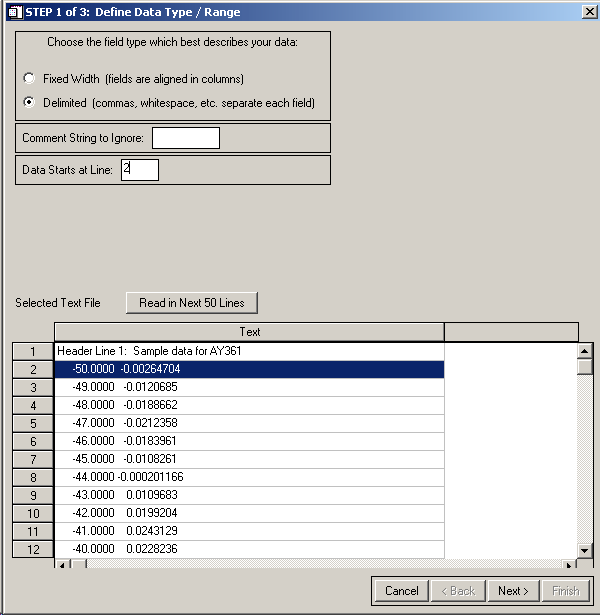 The bottom of the GUI shows you the file, while the top allows you to specify a few parameters. In this case we want to use 'Delimited' data and want to start reading data on line 2. It is common in ASCII data files to utilize a Comment String to make things more human-friendly -- you will see later that the Small Radio Telescope produces a data file which starts all comment lines with a '*' -- ASCII_TEMPLATE() provides an easy mechanism for ignoring these lines when reading in data.
