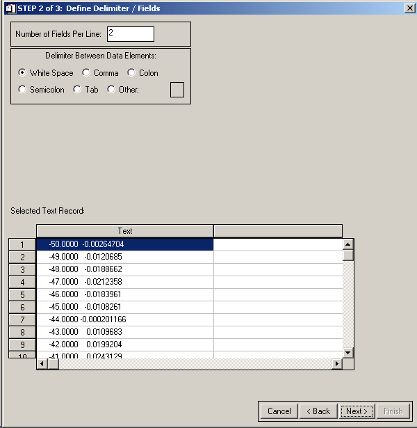 We are using White Space to delimit columns in this file and we see there are 2 fields per line. Set this up and hit Next>
