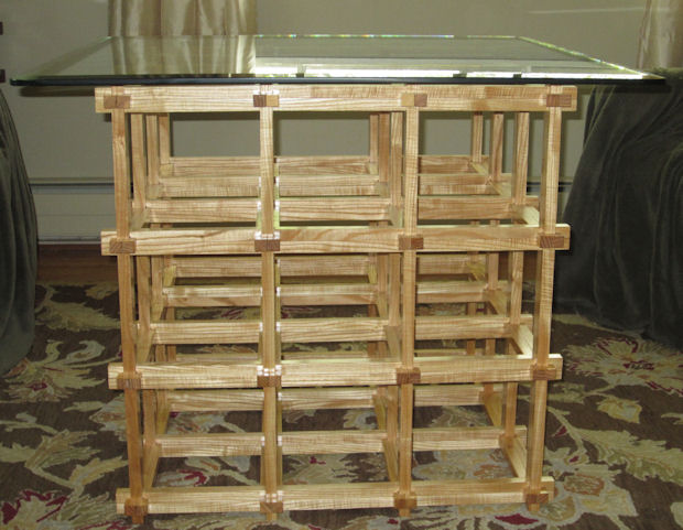Making simultaneous joinery is a demanding task since exacting dimensions are critical. Poorly cut joints will either be loose or they will not close up properly. One could glue up simultaneous joints and get away with having looser tolerances but you would need an adhesive with a very long pot life and it would be a messy glue-up. Our pieces are all glue-less construction so they could be disassembled and repaired. We have a few examples of furniture made with glue-less simultaneous joints and they have held tight for about 20 years now.