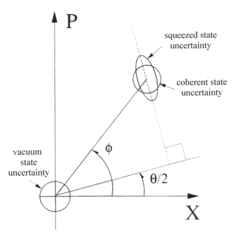 Schematic diagram of the uncertainty areas in the generalized coordinate and momentum (X, P) phase space of a photon squeezed state (ellipse) and a coherent state (circle). In quantum optics, X and P are the two quadratures of the electric field. Notice that the coherent state has the same uncertainty area as the vacuum state (circle at the origin), and that its area is circular, while the squeezed state has an elliptical uncertainty area. Therefore, in the direction parallel to the q/2 line, the squeezed state has a smaller noise than the coherent state.
