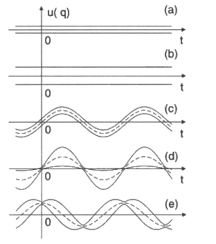 (e) A single-mode phonon squeezed state, as in (d). Now the expectation value of u is <u(±q)> = 2|aq|sinwqt, which means that aq is purely imaginary, and the fluctuation <[Du(±q)]^2> has the same time-dependence as in (d). Notice that the squeezing effect now appears at the times when <u(±q)> reaches its maxima while in (d) the squeezing efffect is present at the times when <u(±q)> is close to zero.