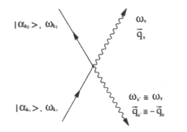 A stimulated second-order Raman scattering process. The subscript k1 (k2) represents the higher- (lower-) energy incident coherent photons. The arrows show the directions of the corresponding photon and phonon momenta. The incoming coherent photon beams are about parallel to each other. The actual physical process is as follows: an incident photon in mode k1 interacts with a solid, producing two acoustic phonons, and leaves in mode k2. For appropriate choice of initial phtoon and phonon states, the acoustic phonons can be in a two-mode squeezed state. Notice that there are also additional incoming photons in mode k2, therefore this mode becomes stronger after the interaction, at the expense of mode k1. Also notice that the vector sum of the two phonon momenta is the difference of the input and output photon momentum vectors. Since photon wave vectors are generally much smaller than the phonon ones |ki| << |qs|, the two acoustic phonon modes have nearly opposite wave vectors ±qs. This figure is not to scale. The appropriate scale in the figure would make all four lines of photons and phonons vertical and almost parallel with each other. For the sake of clarity, we have increased the angle between them.