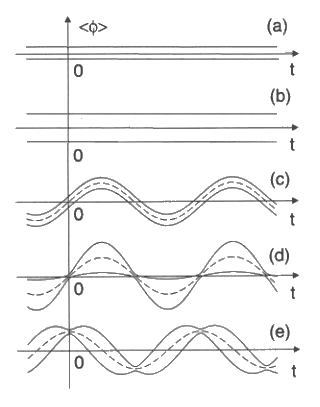 (e) A squeezed state as in (d). Now the expectation value of f is <f>(t) = 2|a|sinwt, which means that a is purely imaginary, and the fluctuation <[Df]^2>(t) has the same time-dependence as in (d). Notice that the squeezing effect now appears at the times when <f>(t) reaches its maxima while in (d) the squeezing effect is present at the times when <f>(t) is close to zero.