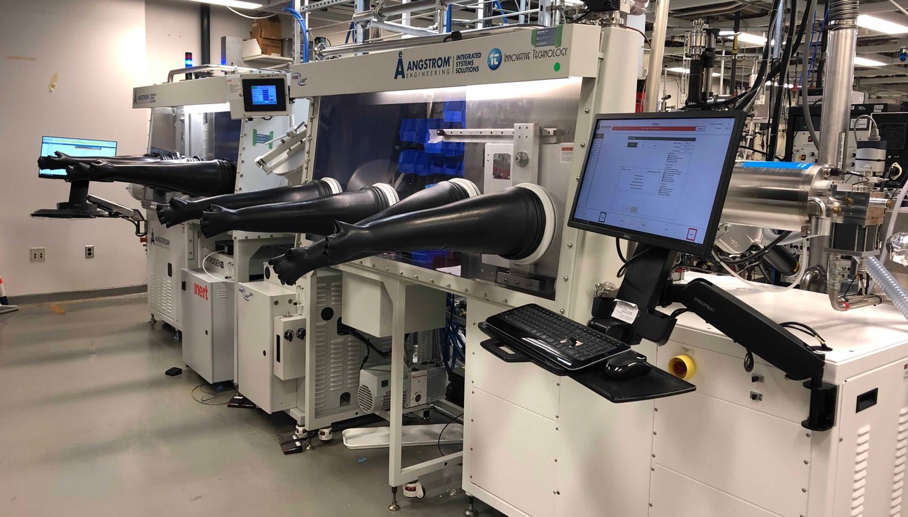 (above) Two front-load thermal evaporation chambers with a total of 16 sources are integrated into a dual nitrogen glovebox system to enable device growth without leaving an inert environment. This system contains 12 Radak sources for temperature-controlled source heating.