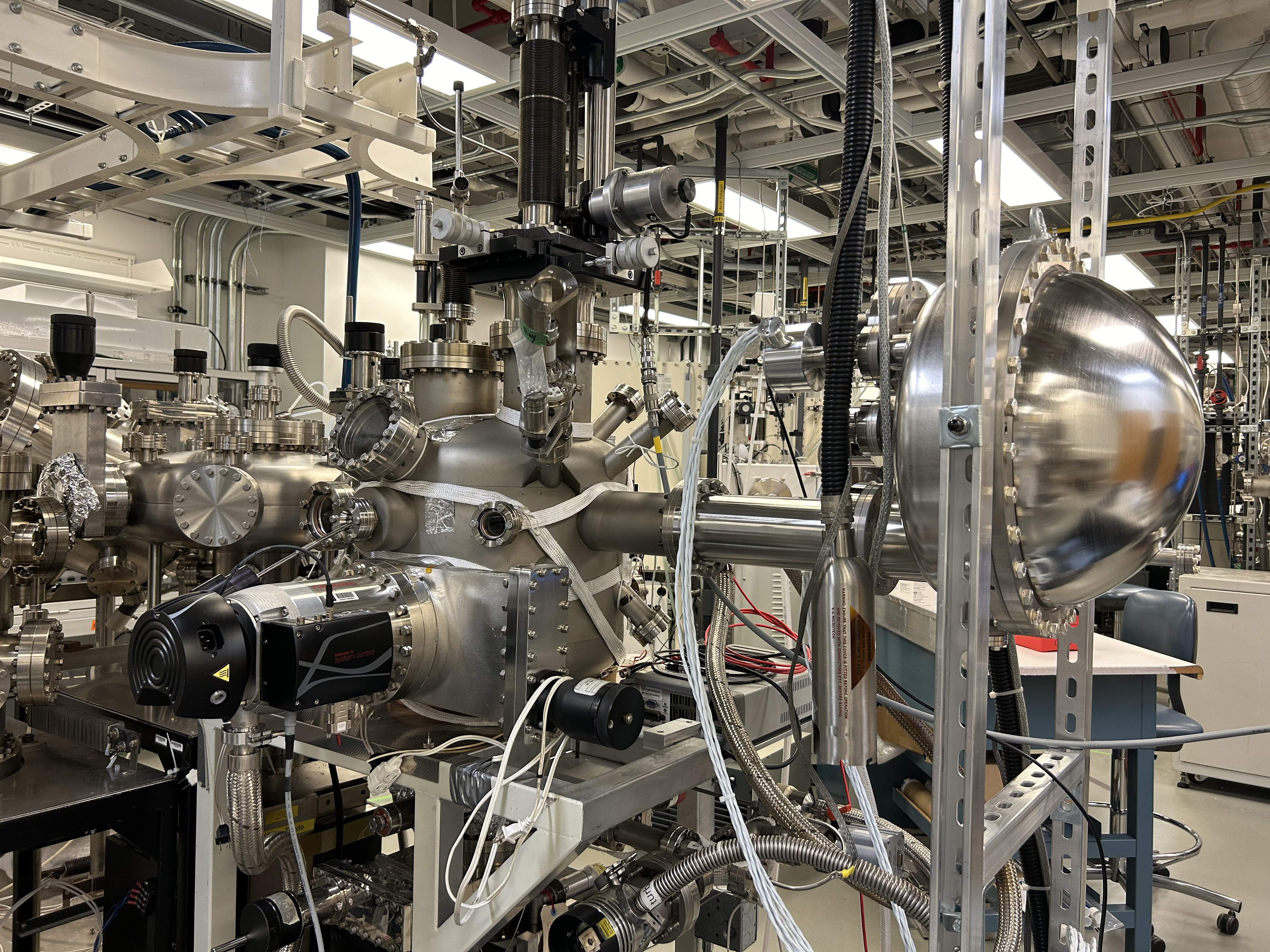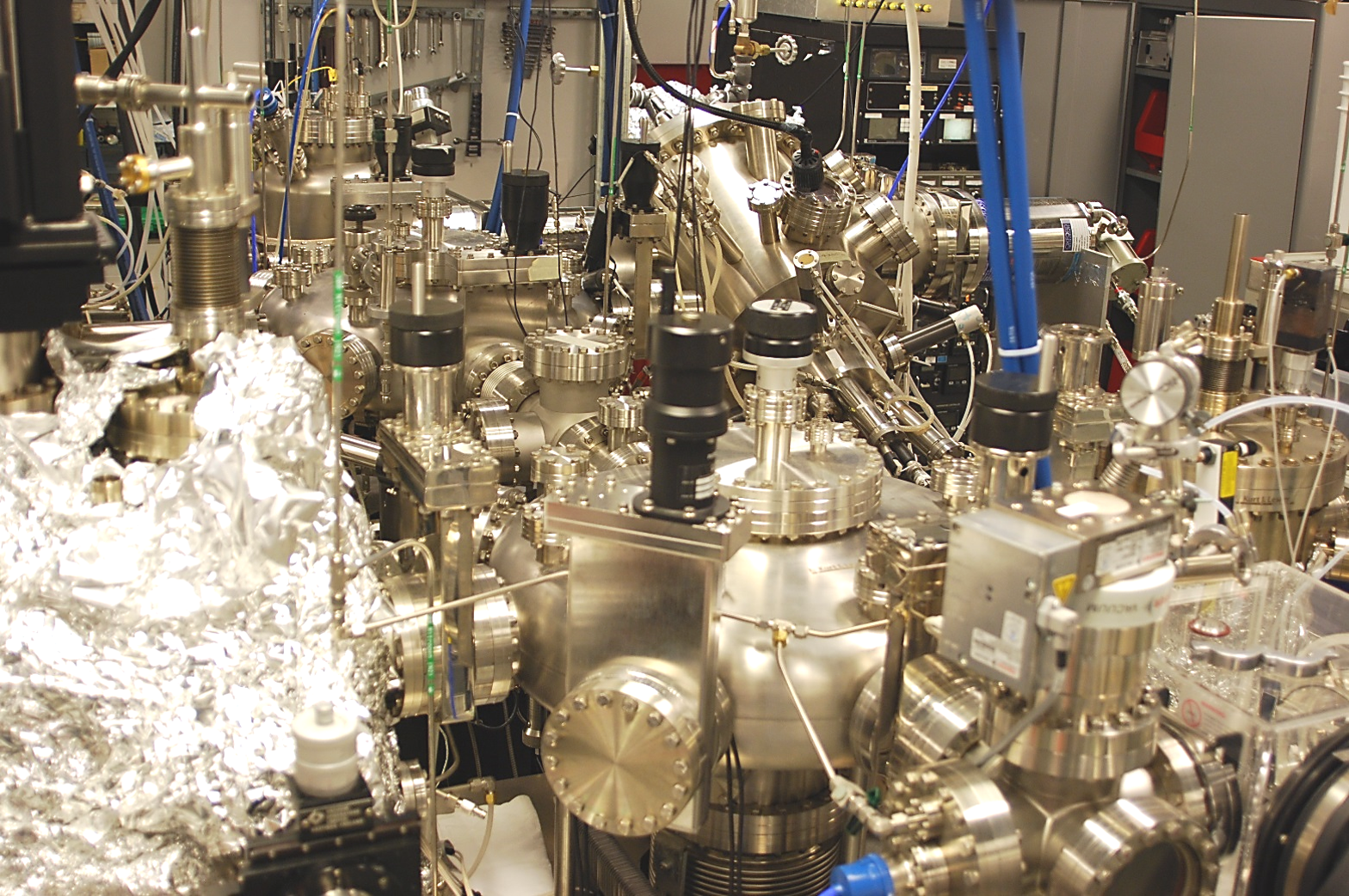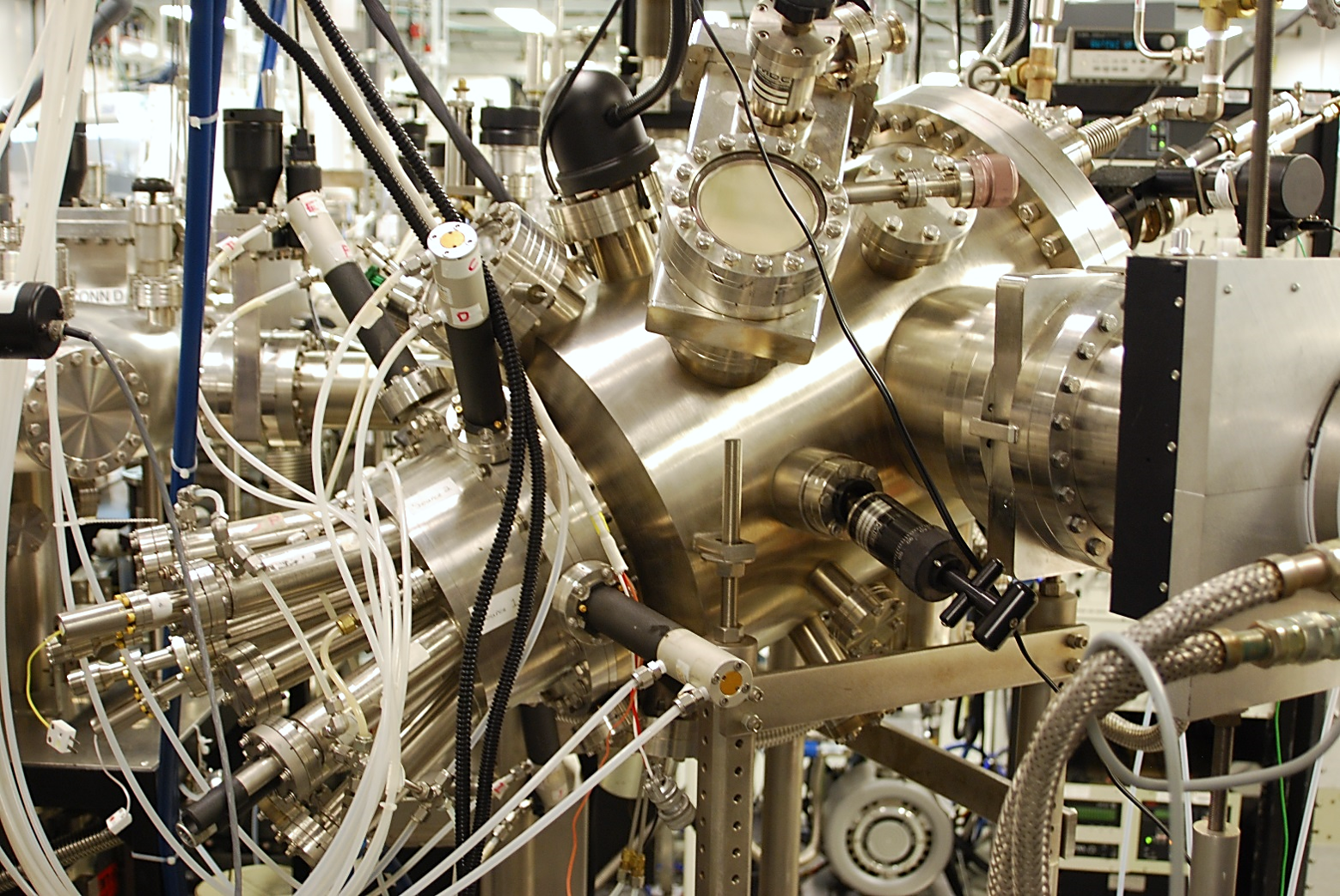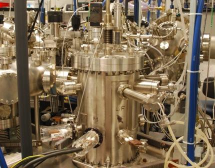 (below) The Organic Molecular Beam Deposition (OMBD) chamber grows organic films in a finely controlled, MBE-like environment. It contains four K-cells for organic materials, whose growth rate and conditions can be measured in-situ using RHEED.