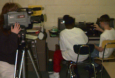 The Video Production Studio is used by Mr. Prince to teach students about video production techniques. The studio has three S-VHS video cameras and two VCRs with video mixing and editing capabilities. With this equipment, the students put on a weekly broadcast for the whole school in which they plan, tape and edit the different segments. Television students anchor the broadcast. Students also do special assignments with the mixers and the computer to expand their knowledge of special effects. Channel One has provided a monitor in each classroom for viewing this presentation along with the Channel One program each morning.