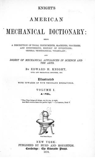 <P>KNIGHT'S AMERICAN MECHANICAL DICTIONARY: BEING A DESCRIPTION OF TOOLS, INSTRUMENTS, MACHINES, PROCESSES, AND ENGINEERING; HISTORY OF INVENTIONS; GENERAL TECHNOLOGICAL VOCABULARY; AND DIGEST OF MECHANICAL APPLICANCES IN SCIENCE AND THE ARTS.</P> <P>BY EDWARD H. KNIGHT, CIVIL AND MECHANICAL ENGINEER, ETC.</P> <P>ILLUSTRATED WITH UPWARDS OF FIVE THOUSAND ENGRAVINGS.</P> <P>VOLUME I. A-FEL.</P> <Q> <L>Thus Time brings all things, one by one, to sight</L> <L>And Skill evolves them into perfect light.</L> <BIBL>LUCRETIUS, Book V.</BIBL> </Q> <P><FIGURE><HEAD>First Steam Engine.</HEAD></FIGURE></P> <P>NEW YORK: PUBLISHED BY HURD AND HOUGHTON. Cambridge: The Riverside Press. 1876.</P> |