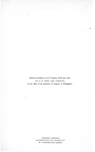 <PB REF="1.11"> <P>Entered according to Act of Congress, in the year 1872, BY J. B. FORD AND COMPANY, in the Office of the Librarian of Congress, at Washington.</P> <P>RIVERSIDE, CAMBRIDGE: ELECTROTYPED AND PRINTED BY H. O. HOUGHTON AND COMPANY.</P> </DIV1> |