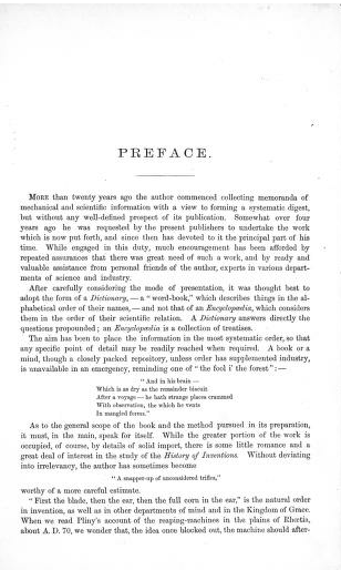 <PB REF="1.12"> <HEAD>PREFACE.</HEAD> <P>MORE than twenty years ago the author commenced collecting memoranda of mechanical and scientific information ... science and industry.</P> <P>After carefully considering the mode of presentation, it was thought best to adopt the form of a <I>Dictionary,</I>—a "word-book," which describes things in the alphabetical order of their names,—and not that of an <I>Encyclopedia,</I> which considers them in the order of their scientific relation. ... </P> <P>The aim has been to place the information in the most systematic order, so that any specific point of detail may be readily reached when required. A book or a mind, though a closely packed repository, unless order has supplemented industry, is unavailable in an emergency, reminding one of "the fool i' the forest":— <Q> <L>And in his brain—</L> <L>Which is as dry as the remainder biscuit</L> <L>After a voyage—he hath strange places crammed</L> <L>With observation, the which he vents</L> <L>In mangled forms.</L> </Q> </P> <P>As to the general scope of the book ... the author has sometimes become <Q><L>A snapper-up of unconsidered trifles,</L></Q> worthy of a more careful estimate.</P> <P>"First the blade, than the ear, then the full corn in the ear," is the natural order in invention ... the machine should afterwards |