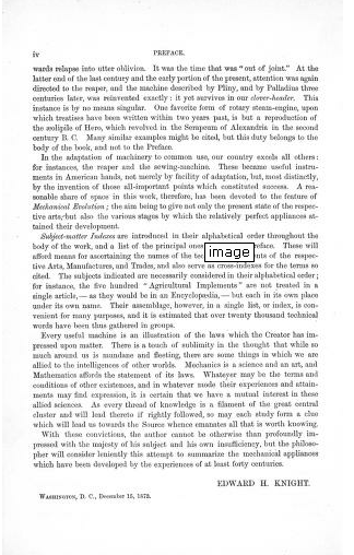 <P>With these convictions ... at least forty centuries.</P> <CLOSER><SIGNED>EDWARD H. KNIGHT.</SIGNED> <DATELINE>WASHINGTON, D. C., <DATE>December 15, 1873</DATE></DATELINE> </CLOSER> </DIV1> |