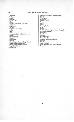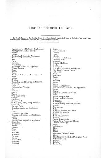 <PB REF="1.14"> <HEAD>LIST OF SPECIFIC INDEXES.</HEAD> <P>The Specific Indexes in the following list are to be found in their alphabetical places in the body of the work. Each index embraces the technical appliances, etc., appertaining to its subject.</P> <LIST> <ITEM>Agricultural and Husbandry Implements.</ITEM> <ITEM>Air Appliance and Machinery.</ITEM> <ITEM>Alarms.</ITEM> <ITEM>...Printing.</ITEM> <ITEM>Projectiles.</ITEM> |