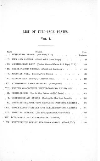 <PB REF="1.16"> <HEAD>LIST OF FULL-PAGE PLATES. VOL. I.</HEAD> <TABLE> <ROW> <CELL ROLE="label">PLATE.</CELL> <CELL ROLE="label">SUBJECT.</CELL> <CELL ROLE="label">PAGE.</CELL> </ROW> <ROW> <CELL>I.</CELL> <CELL>SUSPENSION BRIDGE. (<I>East River, N.Y.</I>)</CELL> <CELL><I>Frontispiece</I></CELL> </ROW> <ROW> <CELL>II.</CELL> <CELL>PIER AND CAISSON. (<I>Illinois and St. Louis Bridge.</I>)</CELL> <CELL>49</CELL> </ROW> <ROW> <CELL>XV.</CELL> <CELL>WORTHINGTON DUPLEX PUMPING-MACHINE. (<I>Newark, N.J.</I>)</CELL> <CELL>763</CELL> </ROW> </TABLE> </DIV1> </FRONT> |