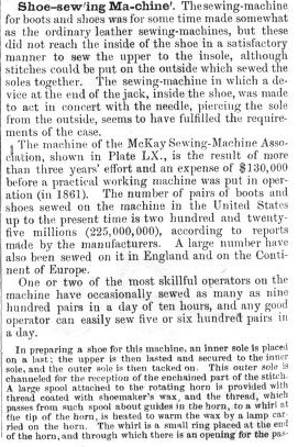 </BODY> </VOL> <VOL N="3"> <FRONT></FRONT> <BODY> <PART N="s"> <E> <HW>Shoe-sew`ing Ma-chine`.</HW> <DEF> <P>The sewing-machine for boots and shoes was for some time made somewhat as the ordinary leather sewing-machines, but these did not reach the inside of the shoe in a satisfactory manner to sew the upper to the insole, although stitches could be put on the outside which sewed the soles together. The sewing-machine in which a device at the end of the jack, inside the shoe, was made to act in concert with the needle, piercing the sole from the outside, seems to have fulfilled the requirements of the case.</P> <P>The machine of the McKay Sewing-Machine Association, shown in Plate LX., is the result of more than three years' effort and an expense of $130,000 before a practical working machine was put in operation (in 1861). The number of pairs of boots and shoes sewed on the machine in the United States up to the present time is two hundred and twenty-five millions (225,000,000), according to reports made by the manufacturers. A large number have also been sewed on it in England and on the Continent of Europe.</P> <P>One or two of the most skillful operators on the machine have occasionally sewed as many as nine hundred pairs in a day of ten hours, and any good operator can easily sew five or six hundred pairs in a day.</P> <P>In preparing a shoe for this machine, an inner sole is placed on a last; the upper is then lasted and secured to the inner sole, and the outer sole is then tacked on. This outer sole is channeled for the reception of the enchained part of the stitch. A large spool attached to the rotatin horn is provided with thread coated with shoemaker's wax, and the thread, which passes from such spool about guides in the horn, to a whirl at the tip of the horn, is heated to warm the wax by a lamp carried on the horn. THe whirl is a small ring placed at the end of the horn, and through which is an opening for the passage |
