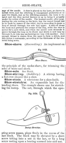 <E> <HW>Shoe-shave.</HW> <DEF> <P><LABEL>Shoemaking.</LABEL> An implement on <FIGURE N="5023"><HEAD>Shoe-Shave.</HEAD></FIGURE> the principle of the spoke-shave, for trimming the soles of boots and shoes.</P> </DEF></E> <E> <HW>Shoe-sole.</HW> <DEF> <P>See <REF>SOLE</REF>.</P> </DEF></E> |