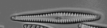 The valve is linear-clavate to lanceolate with an apiculate head pole. The foot pole is narrow. In the central area the median stria is longer that the other striae and comes close to the isolated stigma. The axial area is of variable width. The raphe is lateral undulate. (Kociolek and Stoermer 1990).