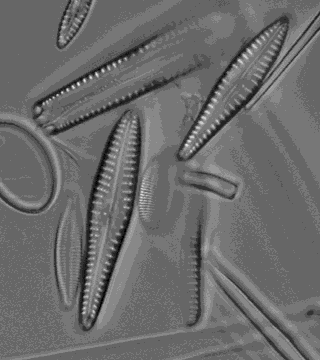 This is a DIF image of the above BF image. This DIF image is from the collection of E. F. Stoermer #1884 showing a portion of the size range of Gomphonema germainii.
