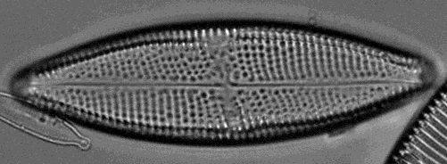 This taxon has broad, bluntly rounded ends which are weakly drawn out. The valve is broadly laceolate. The raphe is filiform. The proximal raphe ends are thin, short hooks. The axial area is narrow and a central area is variously developed. Usually expressed as a diagonal region of poorly developed punctae, the central area sometimes appears to be lacking. The striae are oblique to the raphe and valve margin. The submarginal canal is parallel to the valve margin. There are very distinct punctae (Krammer and Lange-Bertalot 1986). This taxon is occasionally found in collections from all of the Great Lakes. Specimens illustrated are from Lake Superior (E.F. Stoermer collection).