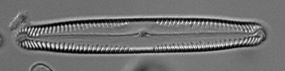 Valve linear or with slightly convex margins; apices rostrate-capitate. Axial area about one-fourth the breadth of the valve; widening toward the central area which is a broad, transverse fascia. Raphe filamentous; terminal fissures and terminal nodules distinct. Striae raditate at the center of the valve, convergent toward the ends(Patrick and Reimer 1966).