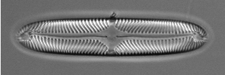 Valve linear-elliptical, narrowing toward rounded ends. Axial area one-fifth the breadth of the valve, widening into the rhomboid central area on each side of which is the thickening characteristic of Pinnularia divergens. Raphe filamentous; terminal fissures "bayonet" shaped. Striae radiate at the center of the valve, convergent troward the ends (Patrick and Reimer 1966).