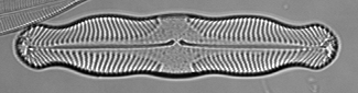 Valve linear with triundulate margins, the central inflation narrower than the other two. Striae strongly radiate at the center of the valve, convergent at the ends. This species is closely related to Pinnularia biceps. It is distinguished by the distinctly triundulate margins which do not seem to intergrade with the straight margins of P. biceps(Patrick and Reimer 1966).