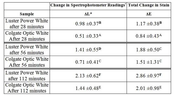 Conclusions: In this In Vitro evaluation, Luster Power White® significantly increased its lightness (ΔL*) compared to Colgate Optic White® after each treatment interval and a ΔE (overall change in stain) at 28 and 112 min.