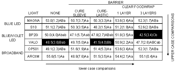 Conversion decrease occurred using Cure-Lastic with the VALO light, or with 3 layers of food wrap on the BP20i. Conclusions: In general, use of curing barrier had no significant effect of the bottom composite conversion value 10 minutes following exposure. Barrier effects were not applied to any given light or barrier, but were found to be specific to unique combinations of the two.